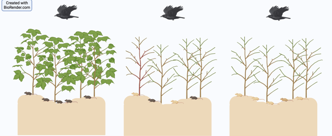 Para entenderlo mejor imaginémonos una población de ratones grises que vive en un prado. A causa de la sequía se seca y deja de crecer la hierba. Estos ratones serán muy visibles para las aves y será más fácil que sean cazados.