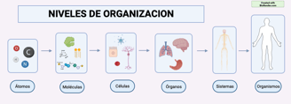 Los seres vivos se organizan para formar estructuras cada vez más complejas. La unidad básica de estructuración es el átomo, varios átomos iguales se juntan para formar un elemento químico, varios elementos químicos iguales o diferentes se juntan para formar moléculas orgánicas o biomoléculas (solo en los seres vivos, recordad que para formar la materia inerte hace falta materia inorgánica).
