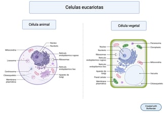 Hay dos tipos de células eucariotas, las células animales y las vegetales. Los dos tipos comparten estructuras, pero también tienen otras que son propias a su tipo celular. Las células vegetales poseen un orgánulo propio, el cloroplasto, encargado de realizar la fotosíntesis. Además su envoltura también es diferente puesto que está compuesta por una membrana plasmática rodeada de una pared celular más rígida que les ofrece una función de soporte y estructural. Las células eucariotas también tiene un orgánulo propio, los centriolos.